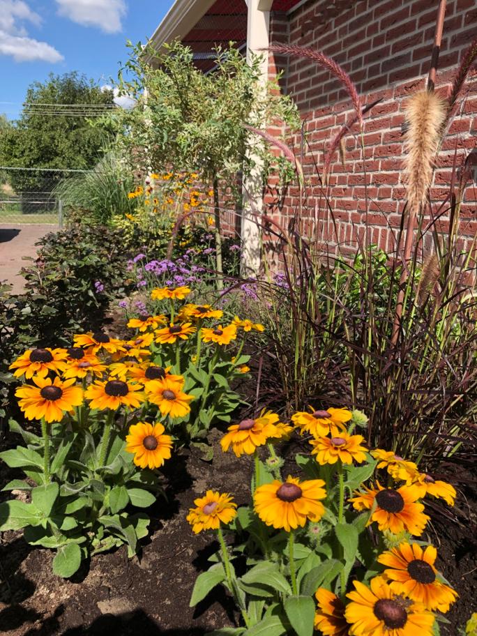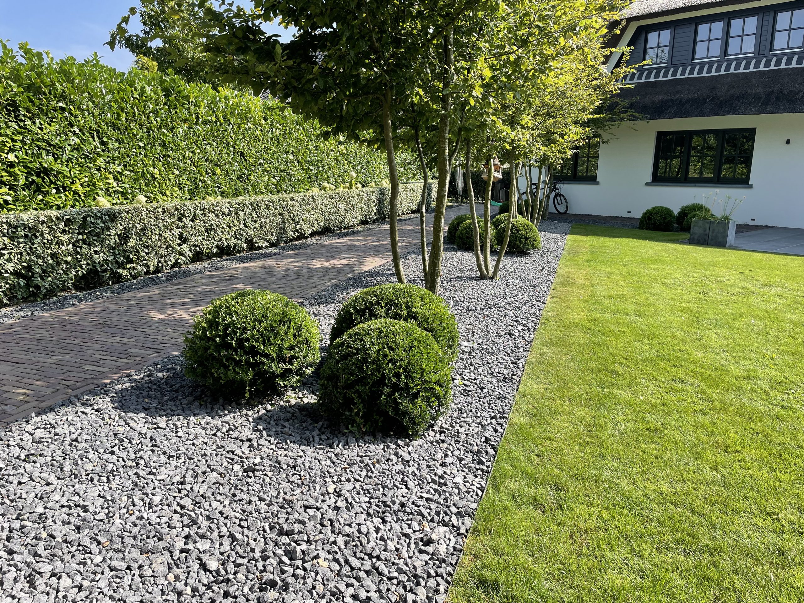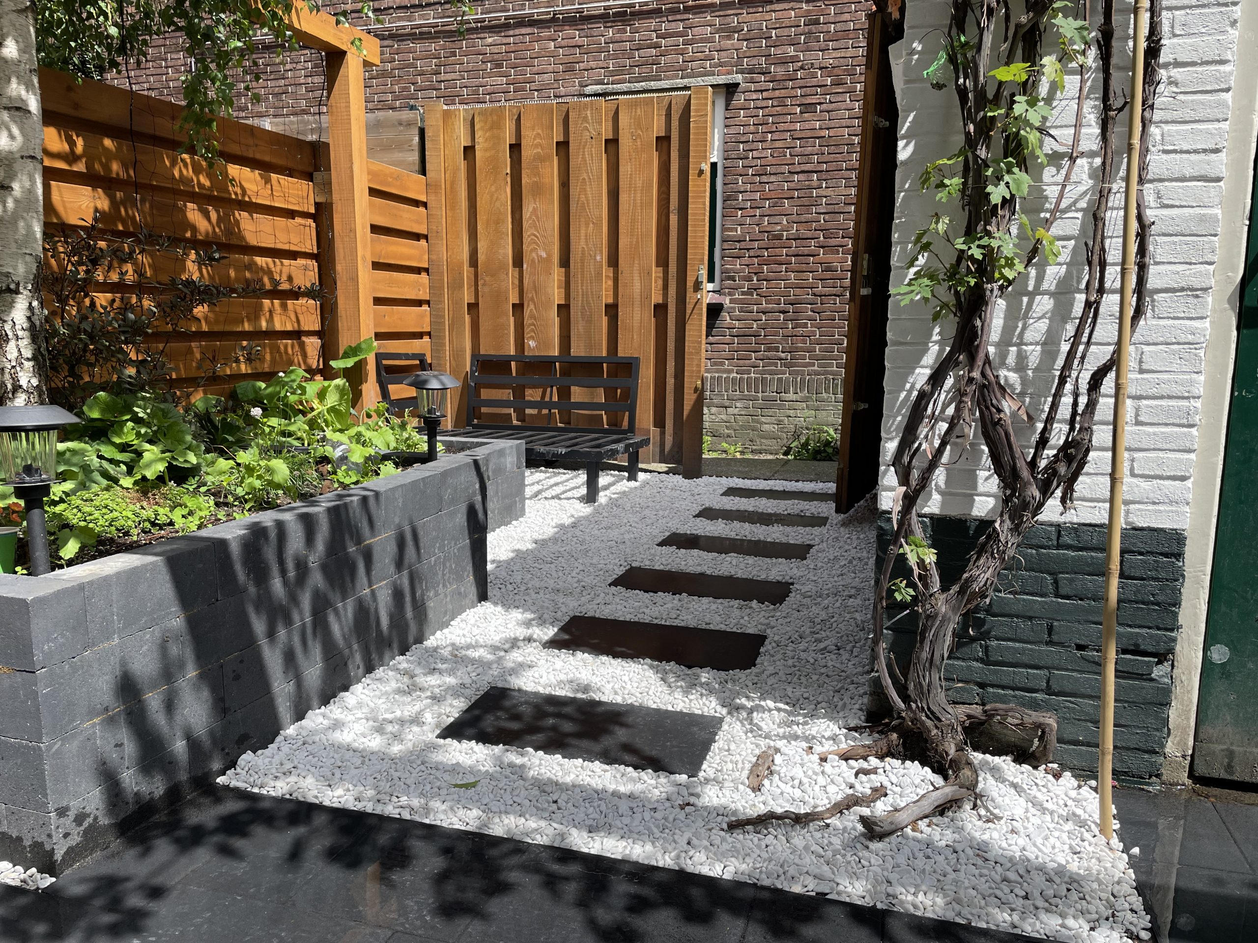 Dit buitenhuis heeft een sfeervolle upgrade genoten door het plaatsen van een vlonder inclusief hemelbed. Door het gebruik van verschillende materialen als kastanje palen, steigerhout en een teakhouten tafel omringd met beach pebble stones is een natuurlijke sfeer gecreëerd die opgaat in de omgeving. Om de vlonder heen is een kleurrijke bloemenborder aangelegd die gedurende de zomermaanden uitbundig in bloei staat. Niet alleen een lust voor het oog maar ook voor de bloemetjes en de bijtjes.